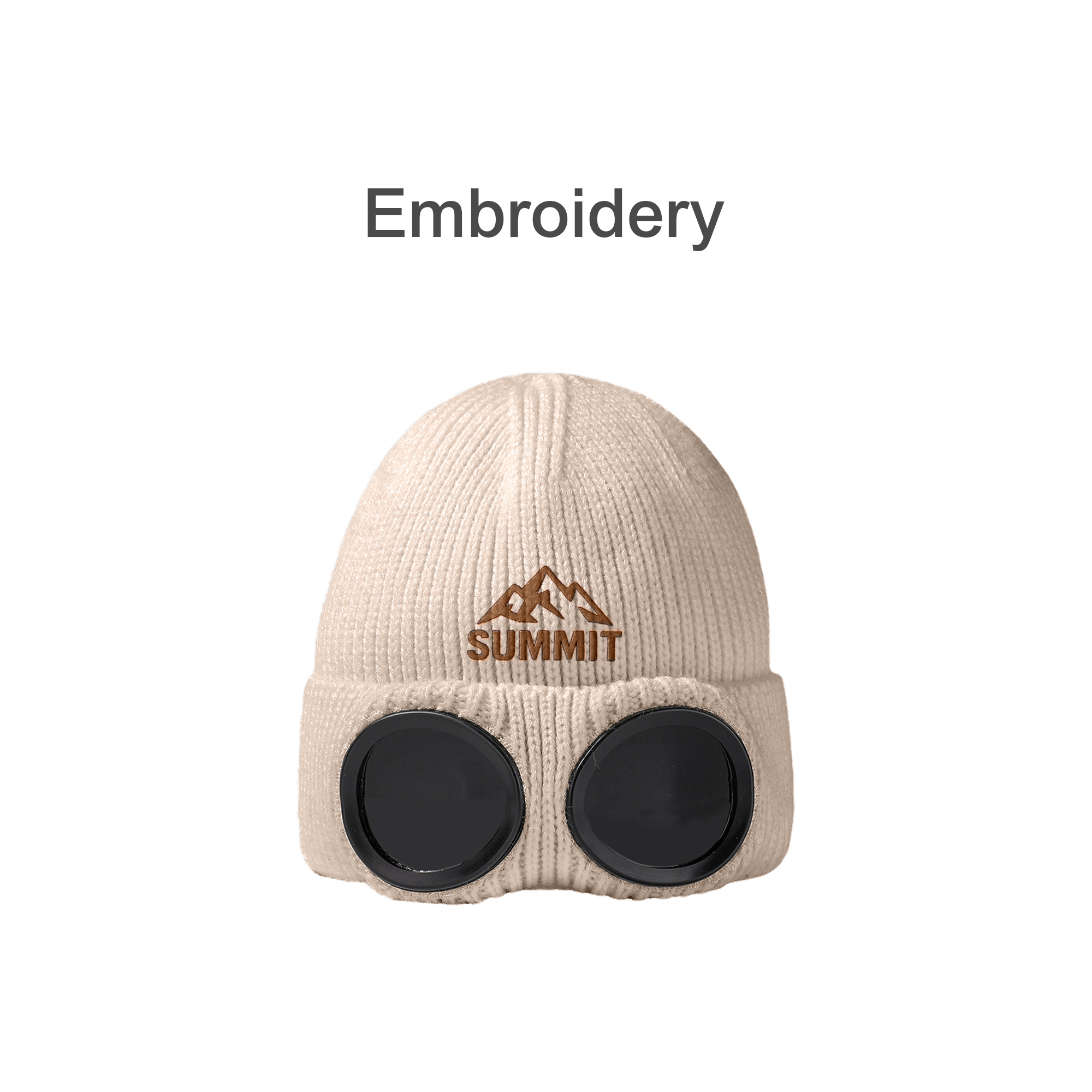 Elevate your style with our Beanie With Goggles! Crafted from elastic acrylic fibre, it boasts a soft touch and superior warmth for cold days. These hats feature a roll-up cuff, with Embroidery and Woven Labels to showcase your design. It comes in 7 trendy colours. Sizing: 22x22 cm. Materials: Acrylic. Price Notes: If you need the beanie lenses to adhere to sunglass lens standards, please let us know, and there will be an additional cost involved. Print Position: Front.3week