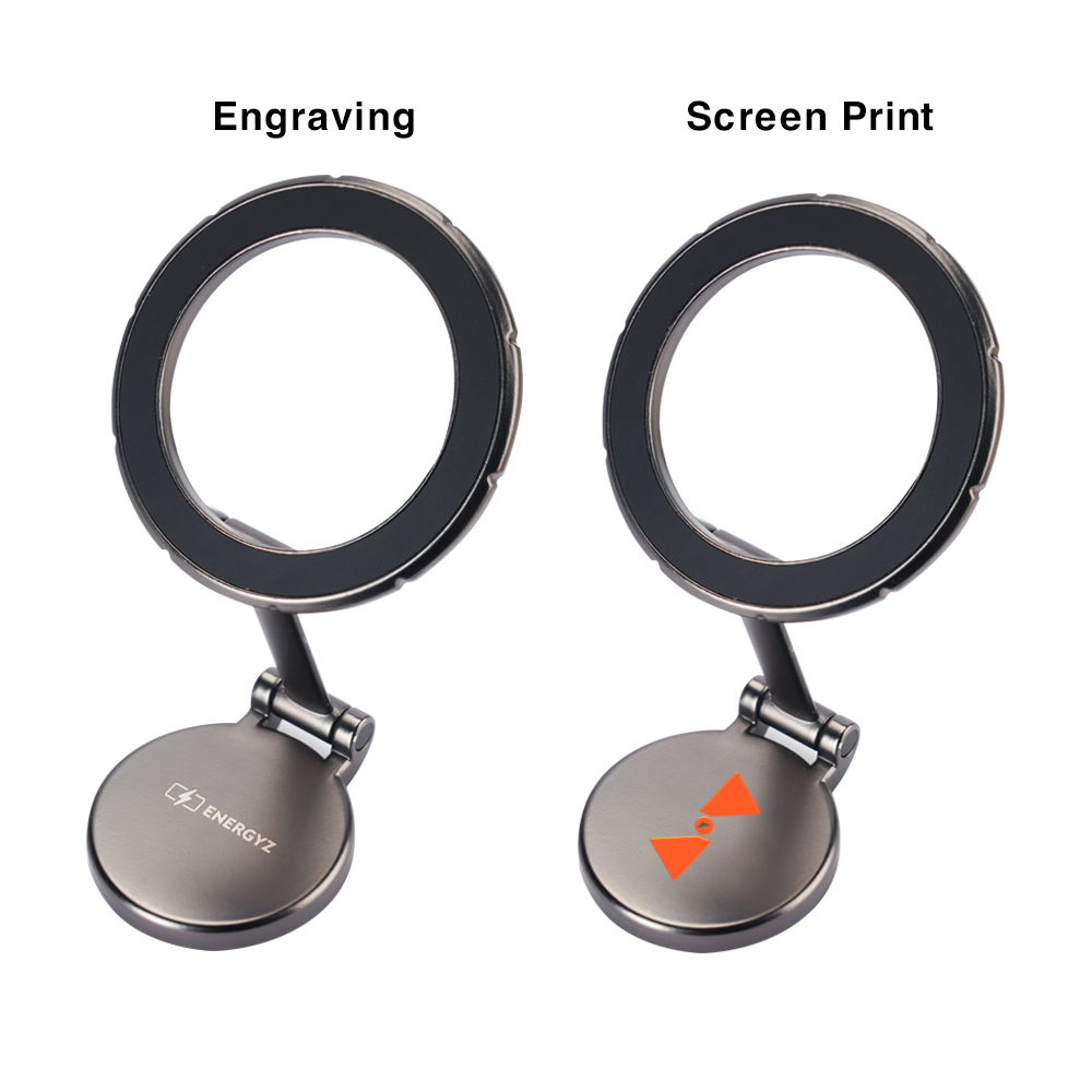 Upgrade your car experience with our Sticky Magnetic Car Phone Holder! Made of zinc alloy and silicone, this sleek black holder offers strong adhesion to glass, plastic, or wood surfaces. The multi-angle rotation ensures the perfect viewing angle. Choose engraving or screen print for a personalized touch. Pack includes a box, holder, 3 magnetic plates, and 3M adhesive. Drive safer and smarter get yours today!. Sizing: Foldable: Dia5.8cm High: 1.7cm. Materials: Zinc alloy, Silicone. Price Notes: Please note: It is not recommended to paste repeatedly. Print Position: Front.4week