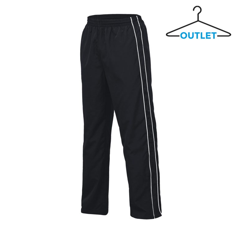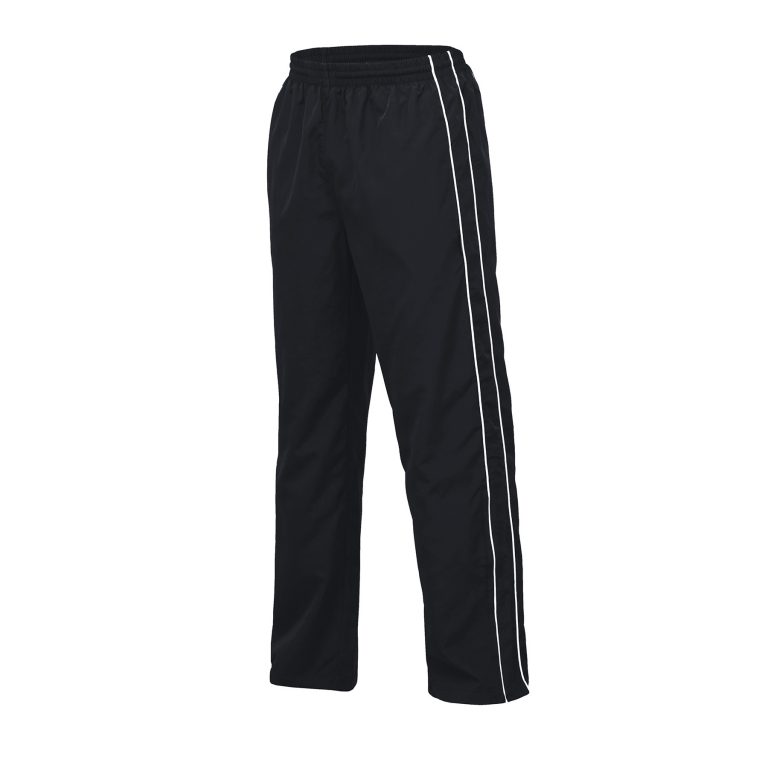 100% polyester microfibre, Classic fit, Twin piping along outseams, Straight leg, Zipper down leg with gusset enlarged hem opening, Onseam side pockets and zippered back pocket, Fully elasticated waist with dyed to match draw cord inside, Upper lined with single jersey, Bottom lined with polyester taffeta. Colours: black/white, navy/white. Sizes: 4XS-5XL
