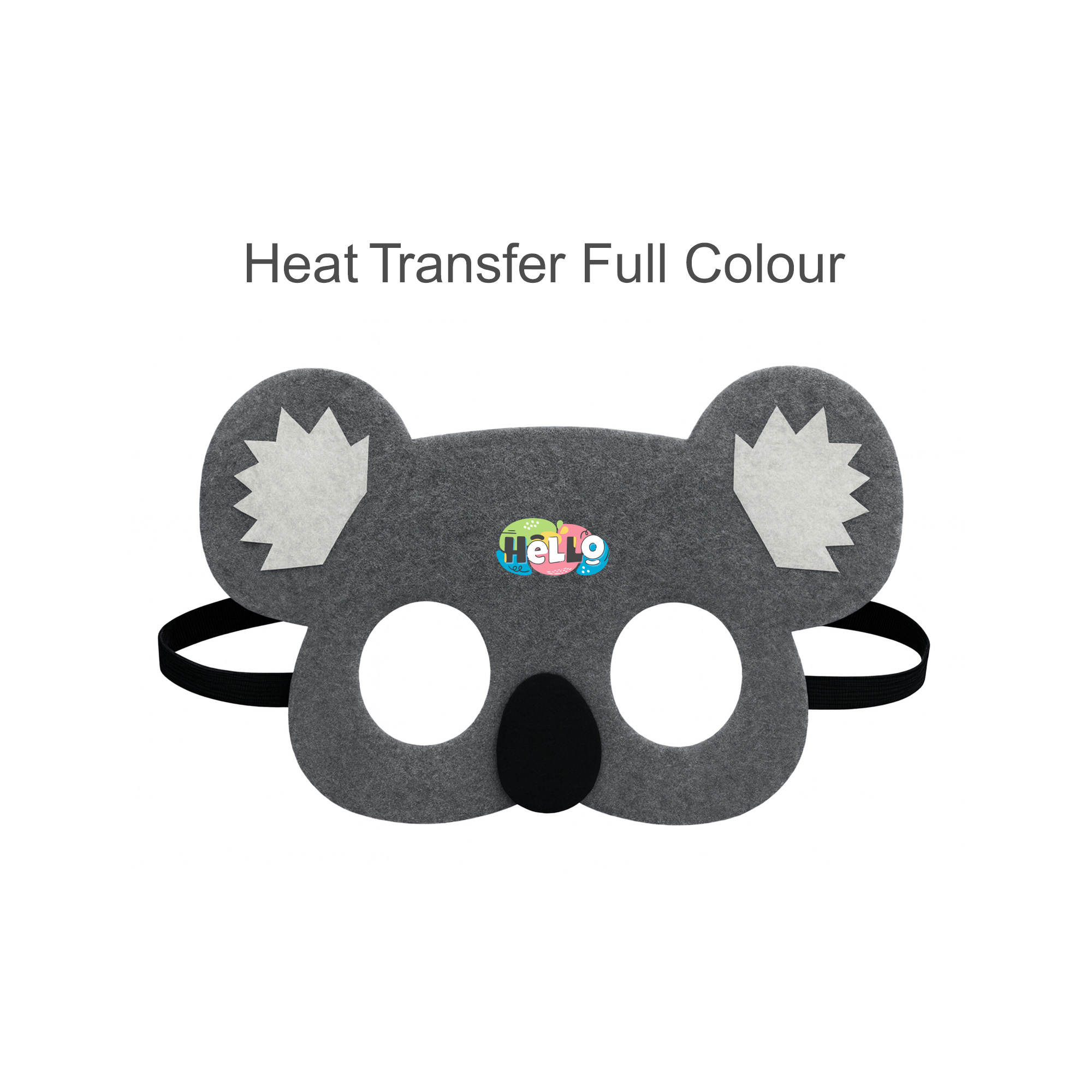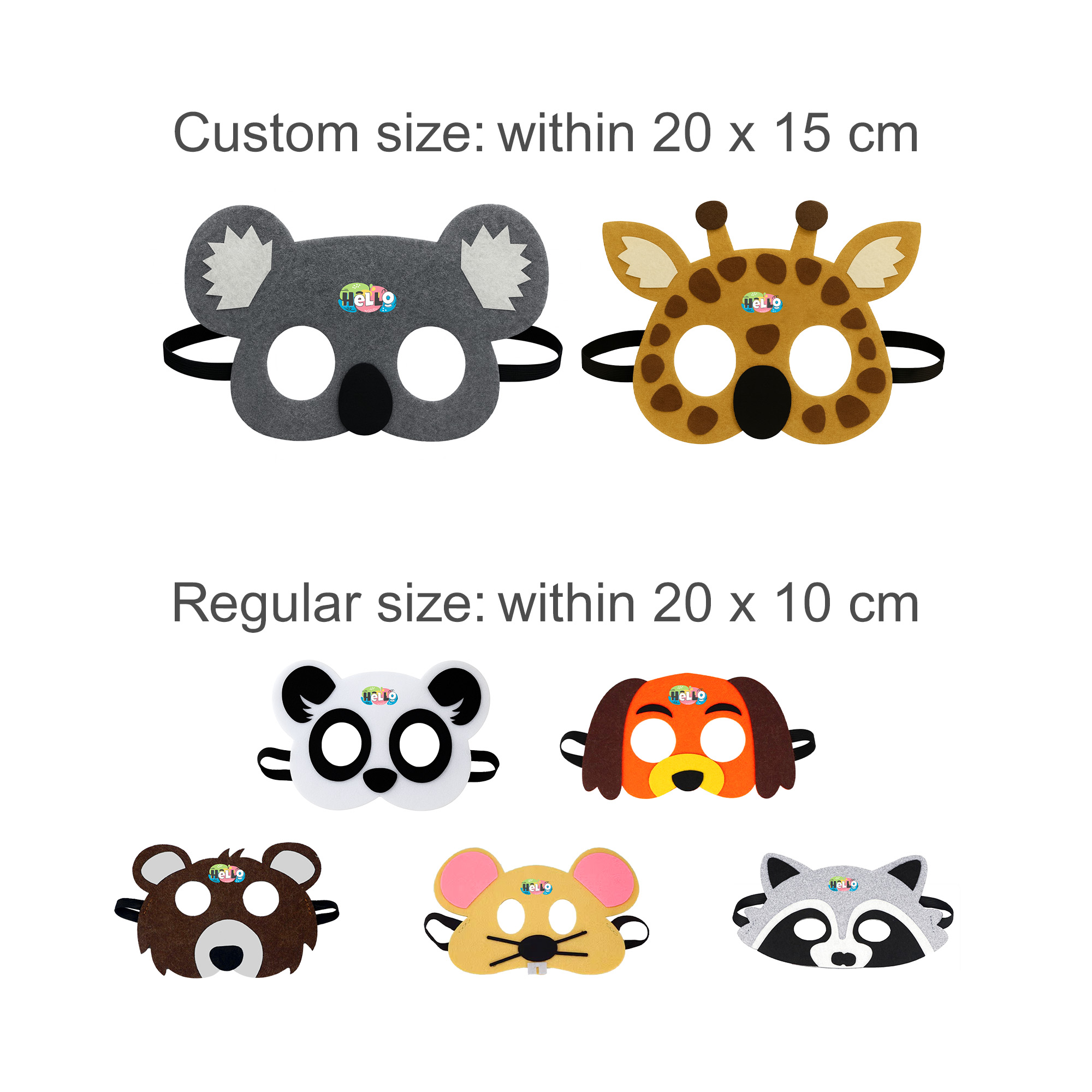 Get your branding seen with our Kids Animal Felt Mask! Made from felt material, these masks are perfect for creative play. With heat transfer full colour print to customize your brand logo. With 5 kinds of regular shapes or custom shape options to choose from, kids can become their favorite animal in style. Ideal for parties, costumes, or everyday adventures. Let s bring their dreams to life!. Sizing: Regular shape: 20 x 10 cmCustom shape: Within 20 x 15 cm. Materials: Felt. Price Notes: Please note that this product is not suitable for children under 3 years old. Print Position: Front.3week